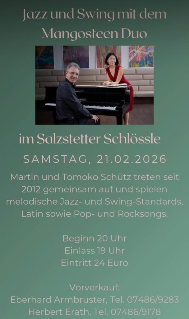 MangosteenDuo spielt Jazz- und Swing-Standards, Latin sowie Pop- und Rocksongs in eigenem Arrangement zu Ihrer Unterhaltung, zum Empfang der Gäste oder dezent im Hintergrund zum Dinner. Gerne spielen wir in kleinem Rahmen auch “unplugged” am Flügel mit leichter Verstärkung für den Gesang.